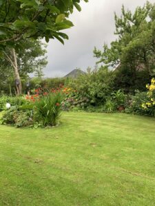 De nøje formklippede buske viser både omhu og kreativitet, og giver haven struktur og personlighed.