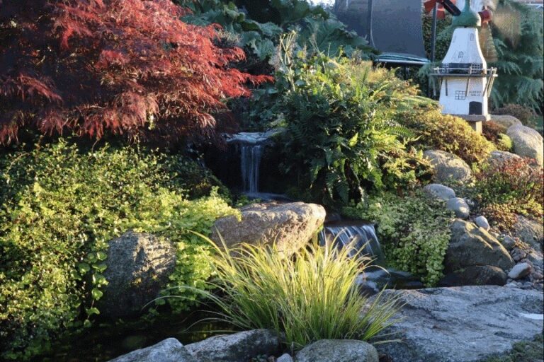 Midt i haven ligger en idyllisk sø, der tiltrækker fugle og insekter og skaber en fredfyldt stemning.